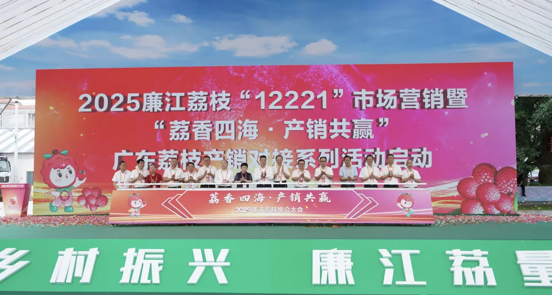 湛江市政协主席李多民,广东省商务厅一级巡视员殷焕明,湛江市人民政府副市长何嘉旻,岭南师范学院党委副书记、校长阳爱民,广东省外语艺术职业学院党委书记马栩生,广东省委网信办相关负责人,广东省统计局二级巡视员李两聪,广东省农业农村厅总农艺师蔡立,湛江市委网信办主任、市互联网行业党委书记汪良波,湛江市农业农村局局长莫植贵,湛江市商务局局长张佩,湛江市统计局局长甘强,湛江市供销社主任叶文新,国家统计局湛江调查队队长、一级调研员许乔峰,廉江市委书记曾平治,市委副书记、市长柯俊等领导出席活动,并共同推杆启动2025廉江荔枝“12221”市场营销暨“荔香四海·产销共赢”广东荔枝产销对接系列活动。